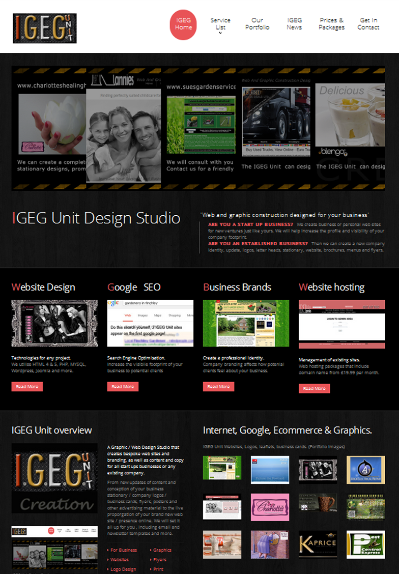 Most of our work comes from referrals by people we have previously completed work for. We use samples of completed works throughout the website and in the portfolio section. Sites may be for the internet of intranet sites for local usage. So if you are in need a company , a personal or a start up business website then get in touch, The IGEG Unit,info@igegunit.co.uk
